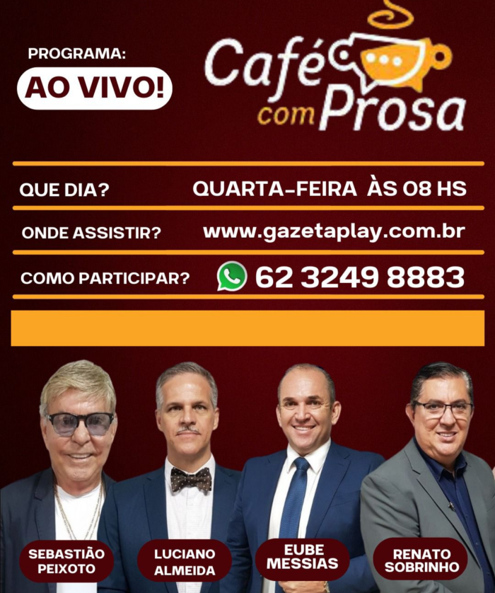 Online, o refinado Café com Prosa pode ser acompanhado no www.gazetaplay.com.br O internauta pode participar. Como? Basta ligar para o WhatsApp 62 32 49 88 83.
