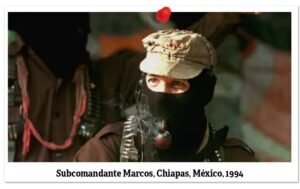 Uma balaclava a encobrir o seu rosto, com boné na cabeça e um cachimbo também no canto da boca, ele é a face performática da revolta antiglobalização do movimento deflagrado em Chiapas, México, ano de 1994. Em defesa dos direitos dos povos originários. Primeiro Subcomandante Marcos. Depois, como Subcomandante Galeano. Um único homem, dois personagens. Uma história que atualiza a senda de Emiliano Zapata. A última das utopias a mobilizar homens e mulheres em uma América Latina fundada na exploração colonial e pelos impérios, desigual e vil pobreza extrema.